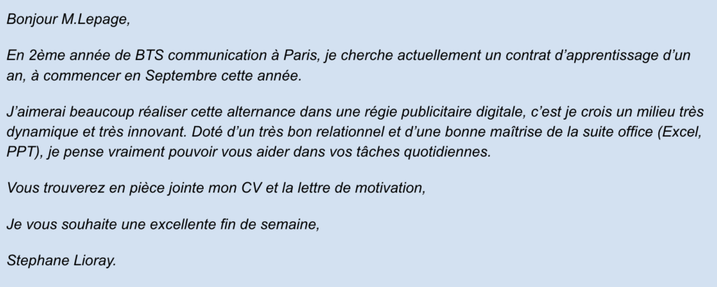 Le corps du mail doit être une synthèse à la fois de votre CV et de votre lettre de motivation. Il ne doit pas être trop long, visez une centaine de mots ! Il est important de se mettre à la place du destinataire. Il est dans son environnement pro, il a cliqué sur votre objet, et il a une minute pour décider si oui ou non il va ouvrir vos pièces jointes, CV et lettre de motivation. Alors on va droit au but :